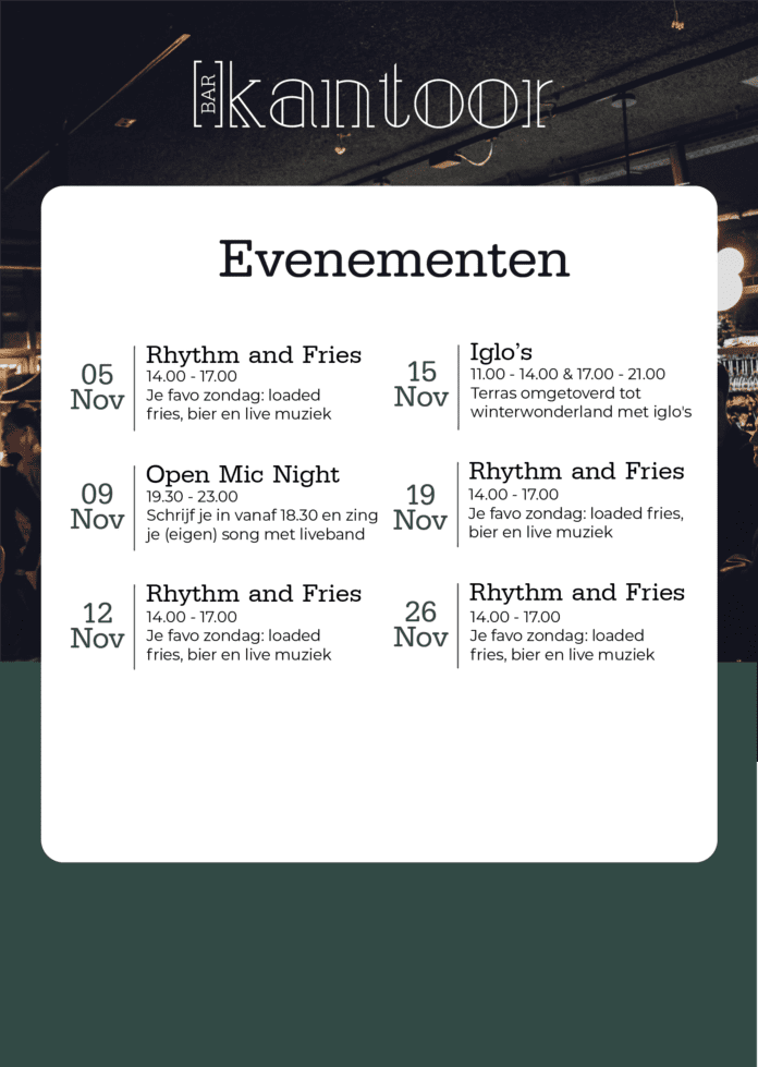Bij Bar Kantoor, oftewel ‘het gezelligste kantoor van Amsterdam’, is verveling verleden tijd. Dit uitnodigende restaurant in het Westerpark heeft in november een aantal geweldige events op het programma staan.