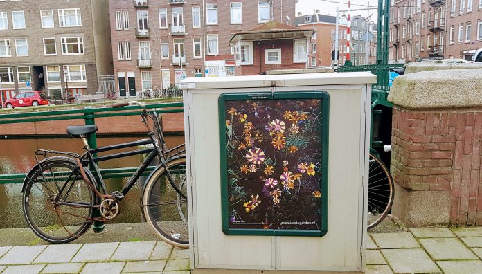 De oplettende voorbijganger heeft ze vast weleens gespot, de bloemenfoto’s van Elspeth Diederix voor haar kunstproject The Miracle Garden. Deze (zie foto) hangt bijvoorbeeld op een elektriciteitshuisje aan de Kostverlorenvaart, bij de Wiegbrug. We zagen er ook een op de Witte de Withstraat, bij Café Nelis.