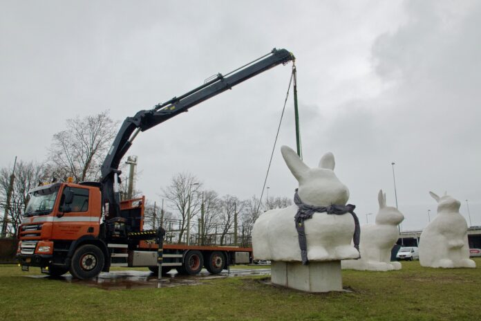Het trio Berm Bunnies langs de nieuwe Hemweg is weer compleet. De kop van een van de metershoge konijnen raakte rond de jaarwisseling beschadigd, vermoedelijk door zwaar vuurwerk. Na herstel is het beest donderdagochtend weer teruggeplaatst.