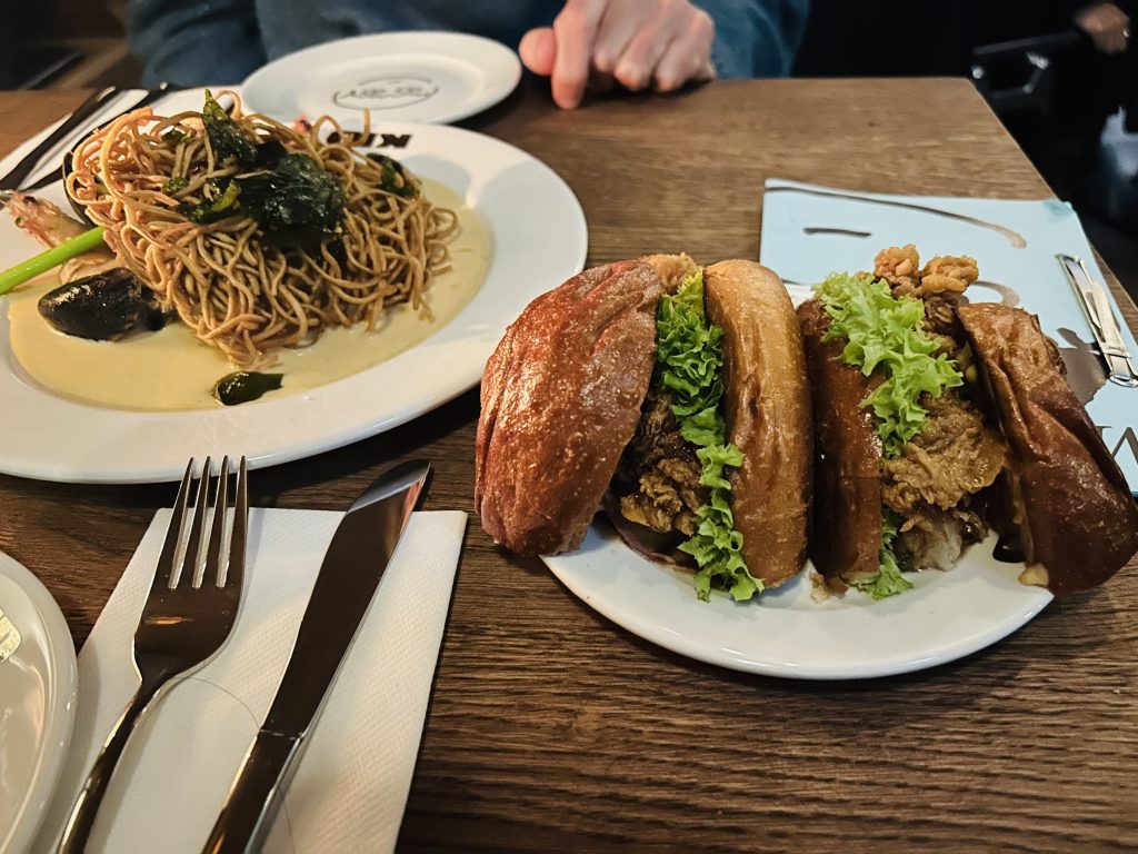 De garnalen en de mosselen van de seafood dish eten ook weg als snoepjes. Even dippen in de romige saus van gezouten eigeel, terwijl ik daar tegelijkertijd de knisperende noedels doorheen sleur. Een fraaie compositie die me doet denken aan het goddelijke Thaise gerecht dat je in Nederland alleen bij Thai Thai Poppetje in De Baarsjes kunt eten: khao soi.