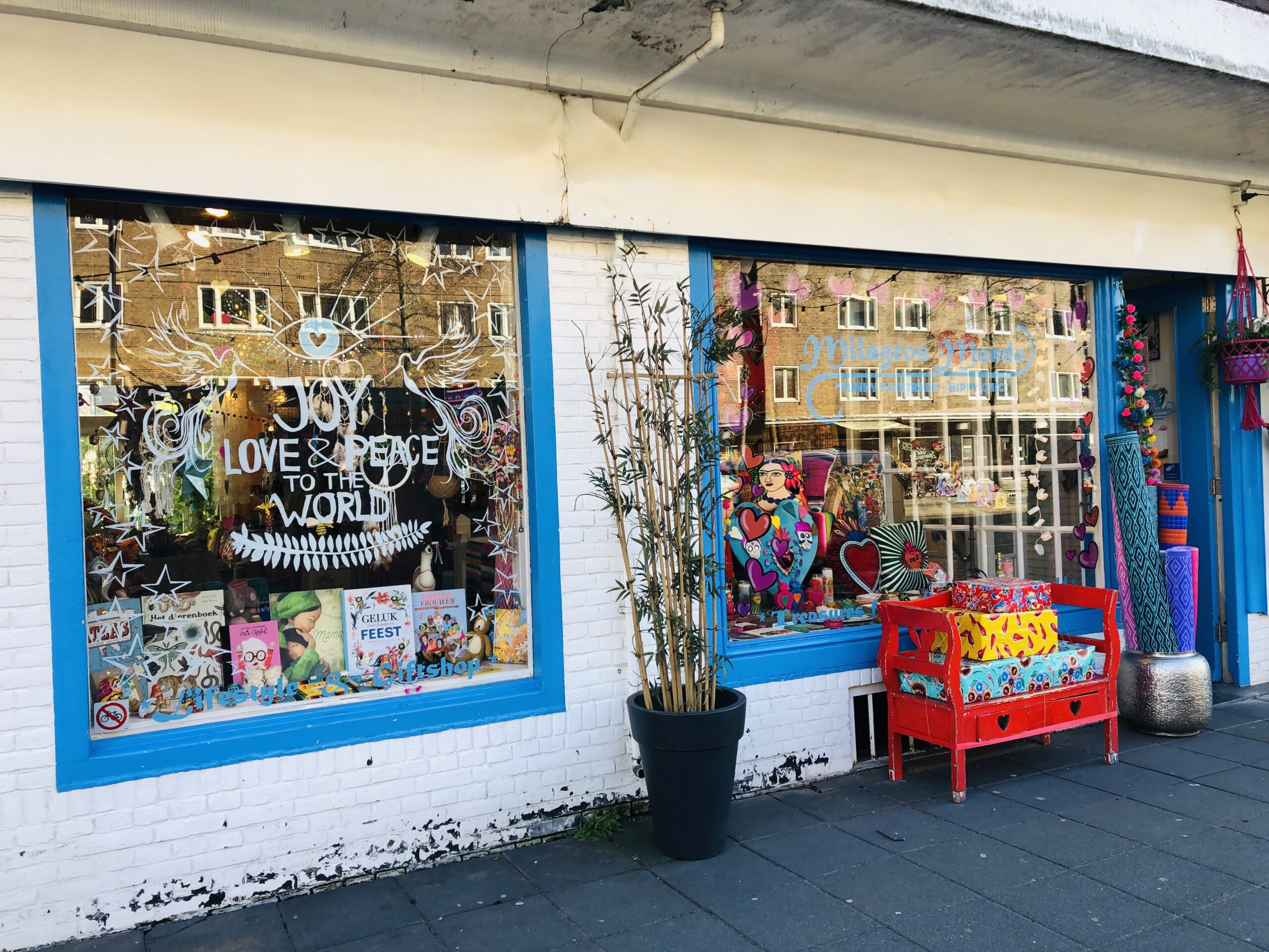 Twaalf jaar geleden opende zij haar eclectische mini-warenhuis aan de Postjesweg. Alle spullen die ze verkoopt bij Milagros – Spaans voor ‘wonderen’ – zijn kleurrijk en multicultureel. Over haar doel is ze duidelijk: “Ik wil positive vibes brengen. Ik hoop dat mensen hier blijer weggaan dan ze binnenkwamen.” Klanten krijgen ruim baan om te dolen tussen gebloemde zijden kimono’s, dromenvangers, hippie chic jurken, kussens met hartjes, Tibetaanse prayer flags en boeketten van vilten bloemen.
