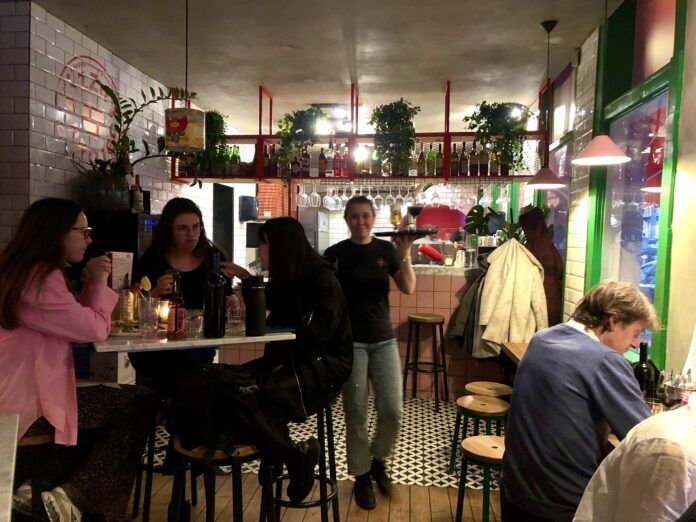 Neapolitan Pizza Bar in de Wilhelminastraat. Veel hout, plus rode, roze en groene accenten. Knus tot en met. Het doet me denken aan het snoephuisje van Hans en Grietje. Aan klandizie geen gebrek. Op alle krukken – hoge en lage – zitten klanten. De sfeer is los, vrij studentikoos. Rap krijgen we de kaart, olijven en een fles water. Een prima start!