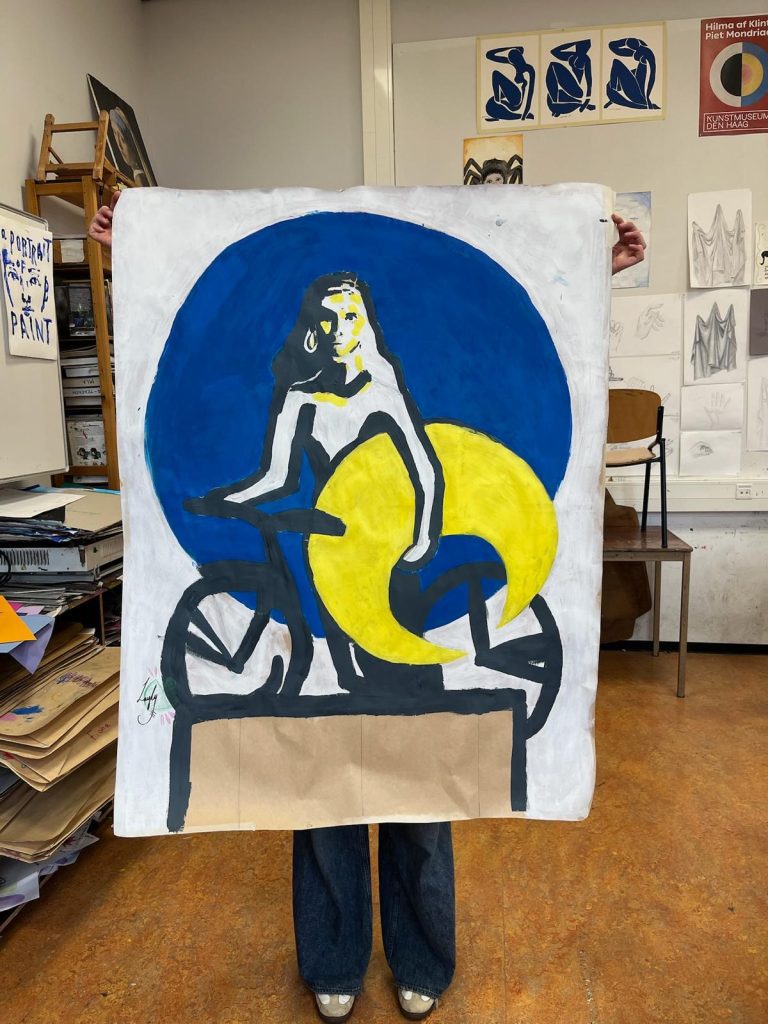Layla: “Ons ontwerp heeft dezelfde kleuren als de campagne ‘Wij eisen de nacht op’. Wij hebben ons erdoor laten inspireren. Je ziet een vrouw met een fiets en een zelfverzekerde blik. Ze kijkt je recht aan, terwijl ze een halve maan stevig onder haar armen heeft geklemd. Net alsof ze de nacht meeneemt.”