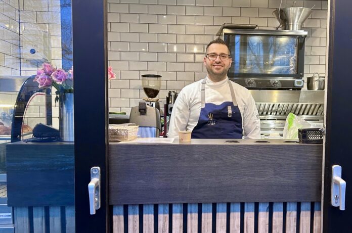 Als ik bij zijn kiosk kom, biedt hij een voorbijganger en mij direct een stukje falafel aan. Dat begint al goed denk ik meteen, terwijl ik naar binnen gluur. Links spot ik croissants, die je onder meer kunt laten beleggen met halloumi en kruidenmengsel za’atar. Rechts zie ik de plek waar hij zijn (smakelijke) falafel frituurt en wraps belegt met pittige kip of köfte.