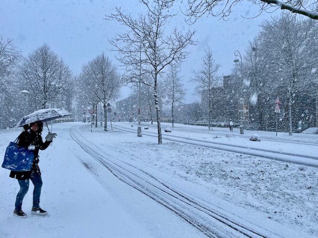 Het KNMI heeft code oranje afgekondigd. In Amsterdam kan maandagochtend 2 tot 5 centimeter sneeuw vallen, plaatselijk zelfs tot 8 centimeter. West werd bedekt met een flinke laag sneeuw. Het treinverkeer rond Amsterdam is kort voor 10 uur stilgelegd. GVB kampt met forse vertragingen.