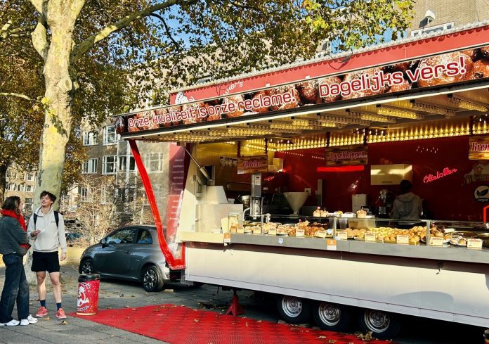 Bij deze kraam in Bos en Lommer at ik vorig jaar op 1 oktober mijn eerste oliebol van dat jaar. Ook dit jaar draait het om bollen, bollen en bollen, zover je oog reikt. Maar dat is zeker niet alles. In de vitrine staan ook soezen en gesuikerde hoorntjes die je kunt laten vullen met slagroom. Ook op het menu: chocoladefruit (banaan, aardbei) op een stokje.