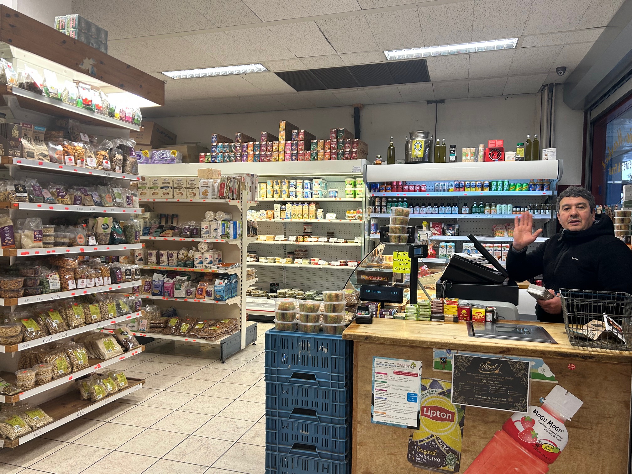 Bij de ingang vind je de pannenkoeken met spinazie en ui die zijn Nederlandse vrouw heeft gemaakt. En dat is zeker niet het enige huisgemaakte of ingekochte product waar je direct je tanden in kunt zetten. Op de vitrine liggen bakjes baklava, daarachter lonken plakken dadelbrood. Té lekker met een likje van zijn vijgenjam, plus een stukje van een van de kazen die Moustapha verkoopt.