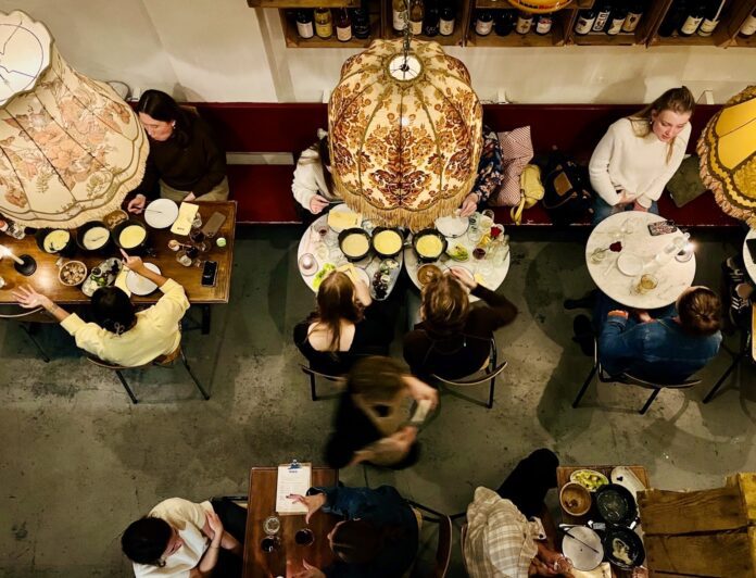 Binnen is het zo knus dat je zin krijgt om op elkaars schoot te kruipen. Kratjes aan de muren met wijnflessen en een verdwaalde kaas. Schemerig licht door lampenkappen zo groot als het hoofd van de gemiddelde reus. Kwieke, soepele ladies in de bediening, die zowat watertandend het menu uitleggen.
