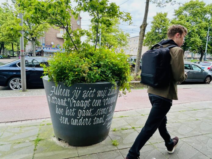 Op plantenpotten aan de Burgemeester de Vlugtlaan staan teksten die stof tot nadenken geven. Initiatiefnemer is het culturele platform Granate uit De Baarsjes.