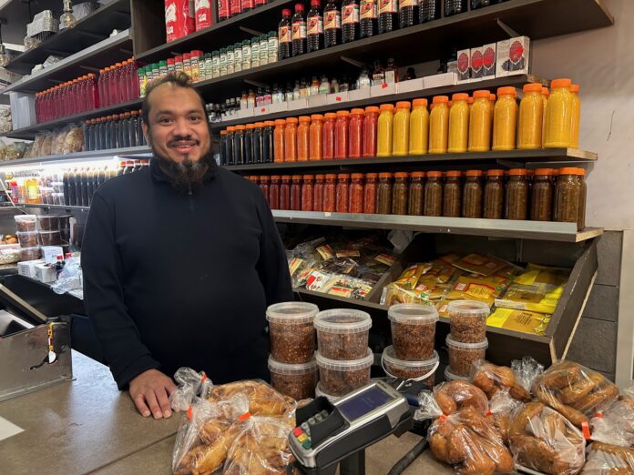 Twee weken geleden was ik voor het eerst bij Rustem in de Ten Katestraat 36. Ik kwam om telo (gefrituurde cassave) met bakkeljauw te kopen. De eigenaar had me toen een sample van de pindasaus gegeven. “Aanlengen met heet water, melk of kokosmelk. Je gaat het lekker vinden.” Dat klopte: de saus was pittig, fris en iets zoet. De broccoli die ik erbij at kreeg er de X-factor door. Hij glundert als ik hem dat vertel. “Mijn vrouw maakt alles wat je hier eet. Haar recepten zijn goud waard.”