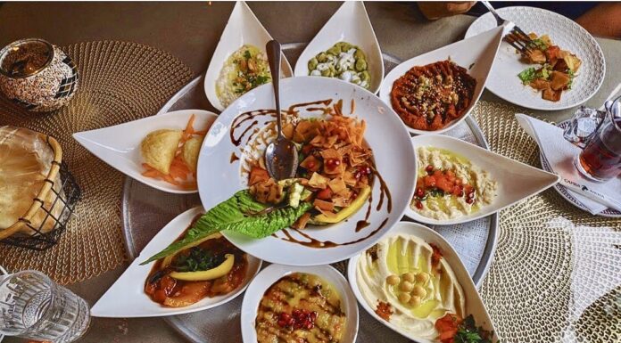 Hier in De Baarsjes kom je voor kleine porties Libanese gerechten. Tussen de koude keuzes vind je een auberginedip met tomaat, paprika en granaatappel, hummus en reuzenbonen met verse peterselie en tomaat. Van de warme happen klinken de inktvisringen met knoflookdip, gegrilde spiesjes van lamsgehakt en de groentenballetjes met dilledip me als muziek in de oren.