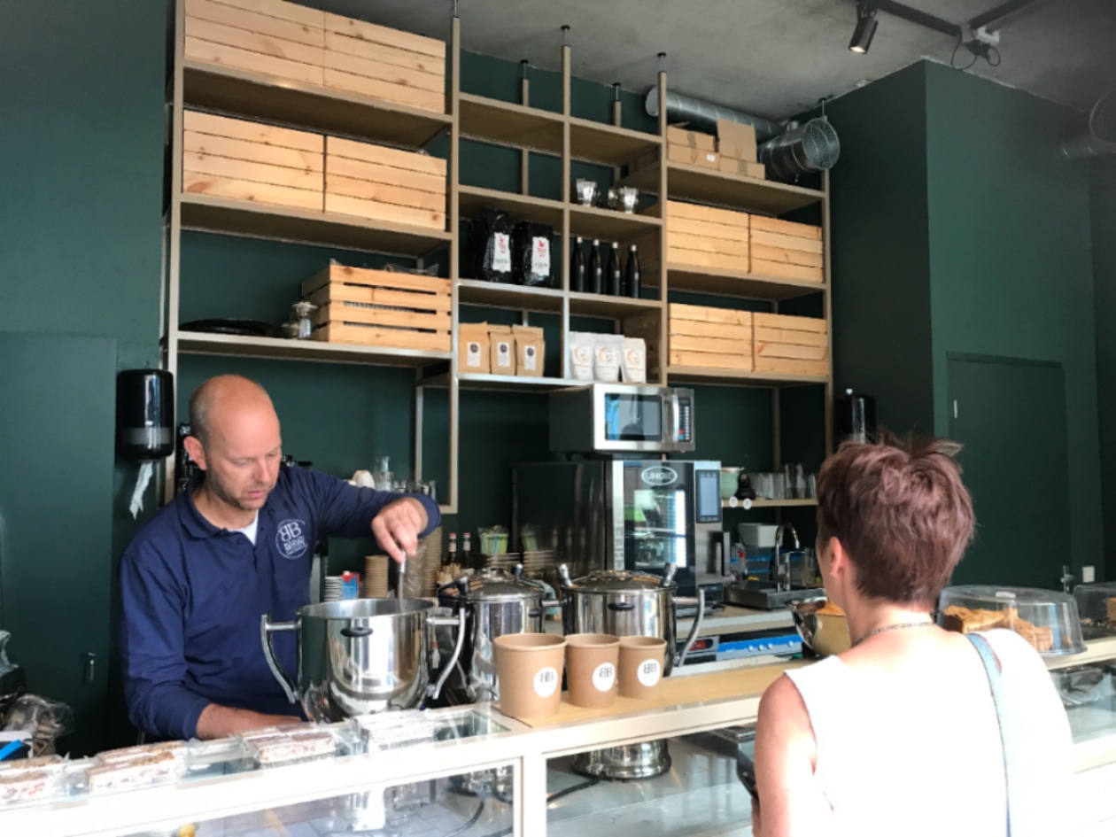 Behalve bouillons – binnenkort ook online verkrijgbaar – verkoopt Joris ook koffie, thee, broodjes, salades en zoetigheid, waaronder steengoed zelfgemaakt bananenbrood. Buurtbewoners weten hem al goed te vinden. Ze komen zomaar even binnen of om bij te tanken na een rondje hardlopen. Het gros babbelt Engels en is aantrekkelijk, de mannen zijn opvallend gespierd. Fijn plekje, hier zo in Houthaven.