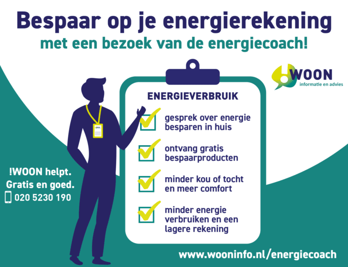 Amsterdammers kunnen een gratis en vrijblijvend bezoek van een energiecoach van !WOON aanvragen. De energiecoach gaat in gesprek over het energieverbruik, gewoontes en kijkt naar de jaarrekeningen. Daarna geeft de coach advies en biedt gratis benodigde producten. Dat kan geld besparen.