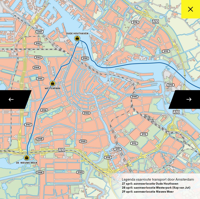 Maandag vertrekt het transport naar de Oude Houthaven. Rond 22.00 uur, als de drukte van Koningsdag voorbij is, vaart het vervolgens de stad in. Via de Staande Mastroute door het Westerkanaal en de Kostverlorenvaart gaat het in de nacht naar de aanlegplaats bij Kop van Jut, bij de Jan van Galenstraat. Daar blijft het ponton overdag liggen, waarna het rond 20.00 uur verder gaat naar de eindbestemming.
