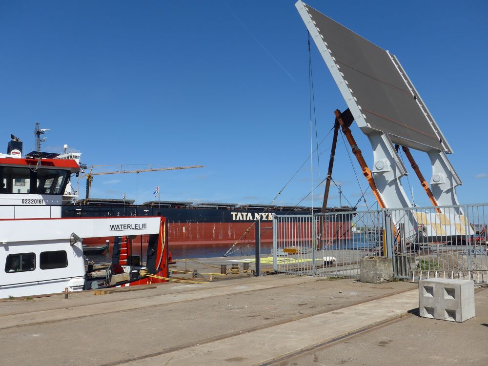 Het brugdeel staat recht overeind op het ponton, omdat het transport anders te breed zou zijn voor de Amsterdamse bruggen en sluizen. Dat maakt het een spannende onderneming, vertelt een bemanningslid van duwboot Waterlelie na aankomst in de Coenhaven. Bij het Friese Goutum bleven kabels die het brugdeel op zijn plek hielden achter een brug haken en knapten. “Dat liep met een sisser af”, zegt hij. “Laten we maar zeggen dat we er allemaal van hebben geleerd.”