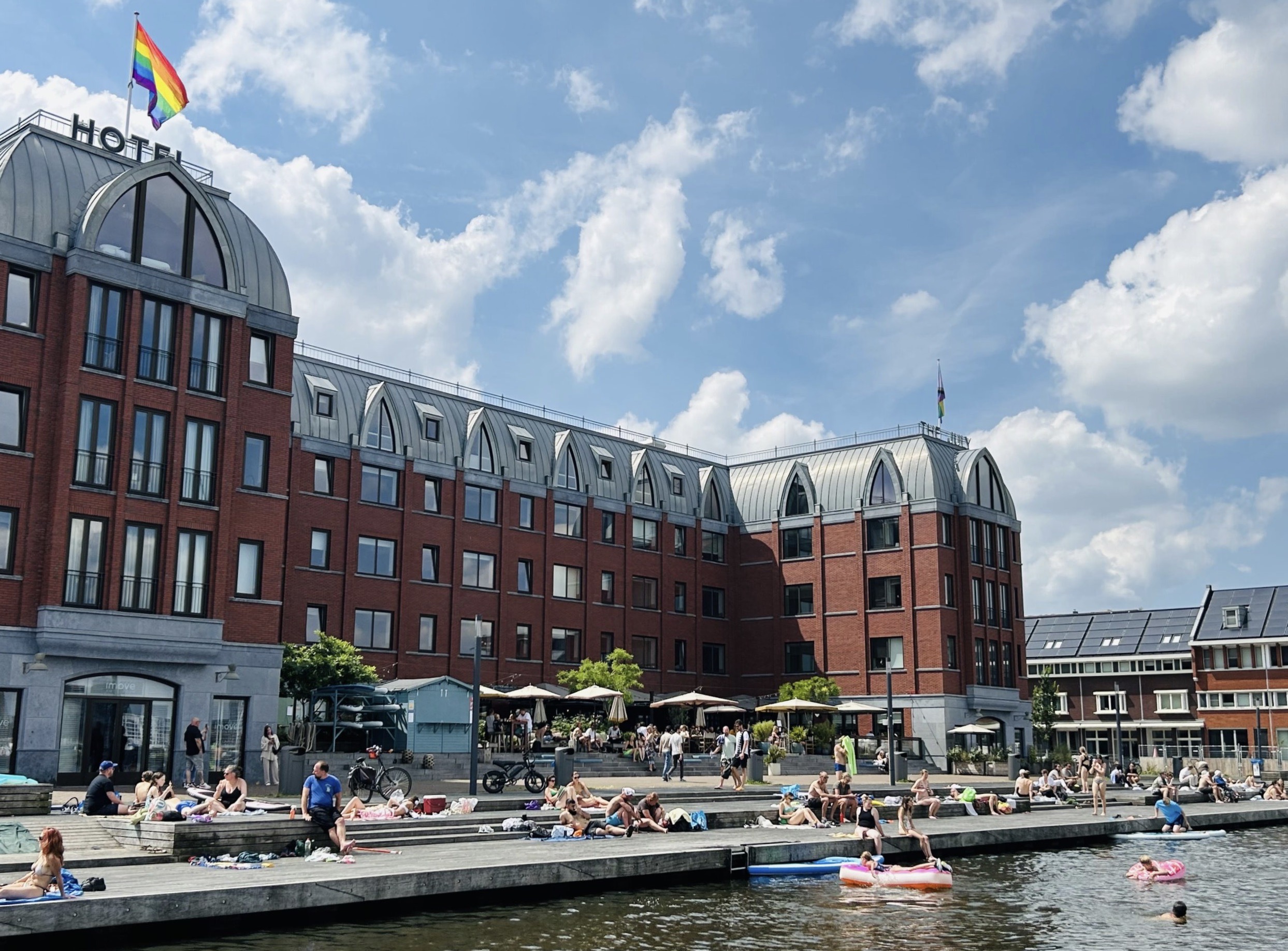 Apartementen-hotel Boat & Co is een tijd geleden ingelijfd door hotelketen The July. Het restaurant heeft nog steeds dezelfde naam: Vessel. Je kunt er de hotelgast uithangen en het ontbijtbuffet boeken. De rest van de dag regent het ook opties: gazpacho, truffelkroketjes, vissoep à la Marseille (bouillabaisse), pasta vongole, een geroosterd piepkuikentje, Basque cheesecake. Maar het allerleukste aan deze plek is toch wel de ligging pal aan het water. Bij mooi weer springt zo’n beetje de hele omgeving er in het water, op een sup of een luchtbed. Spetterende mensen met kwakende eendjes op veilige afstand. Huppelende kids, zonnebadende stelletjes met enkel oog voor elkaar. Chillen, chillen en nog eens chillen. Bij de eerste beste zonnestraal zijn de vlonders bij The July dé hotspot van Houthaven.