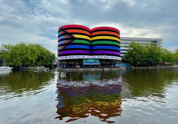 De Europarking aan de Marnixstraat is veranderd in een gigantische Progress Pride vlag. Het gaat om een initiatief van café-restaurant De Waterkant onder het gebouw. Vanaf een ponton langs de Nassaukade heb je goed zicht op de in regenboogkleuren gehulde parkeergarage.
