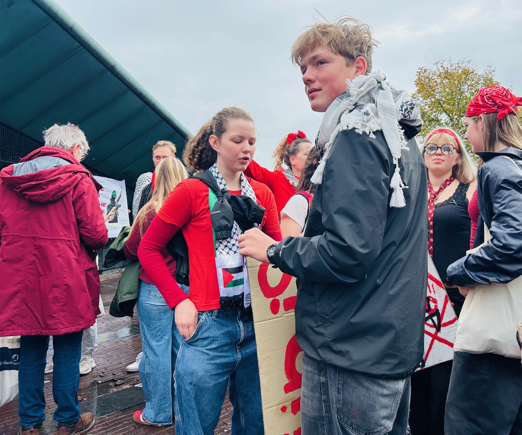 De demonstranten zwaaien met Palestijnse vlaggen en scanderen leuzen: “Free, free Palestina.” “Viva, viva Palestina.” “Children no targets.” “Occupation has to go.”