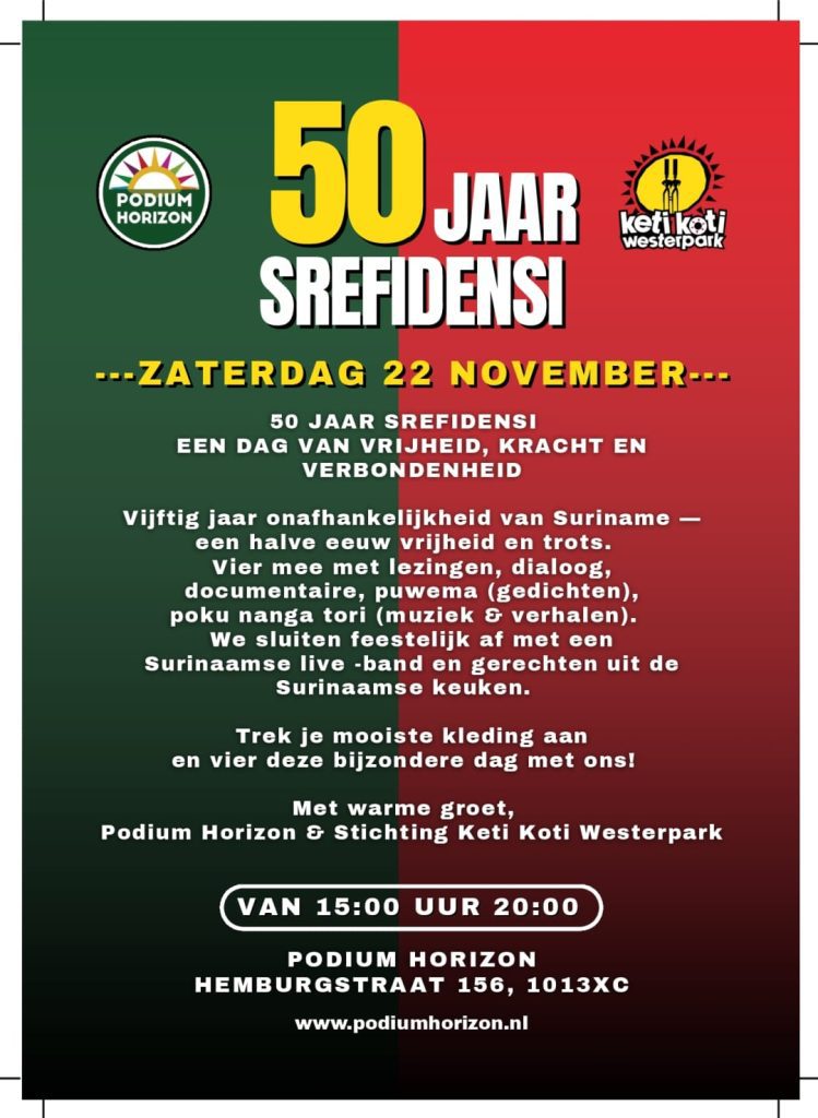 Stichting Podium Horizon en Keti Koti Westerpark staan komende zaterdag 22 november samen stil bij 50 jaar onafhankelijkheid van Suriname.
