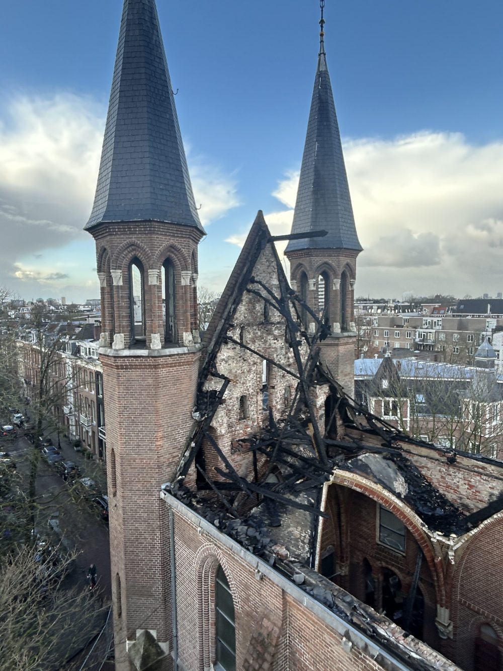 De monumentale kerk in Oud-West raakte zwaar beschadigd door brand in de oudejaarsnacht. De oorzaak staat nog niet vast, maar buurtbewoners vermoeden dat vuurwerk de boosdoener is geweest. De politie heeft dit nog in onderzoek.