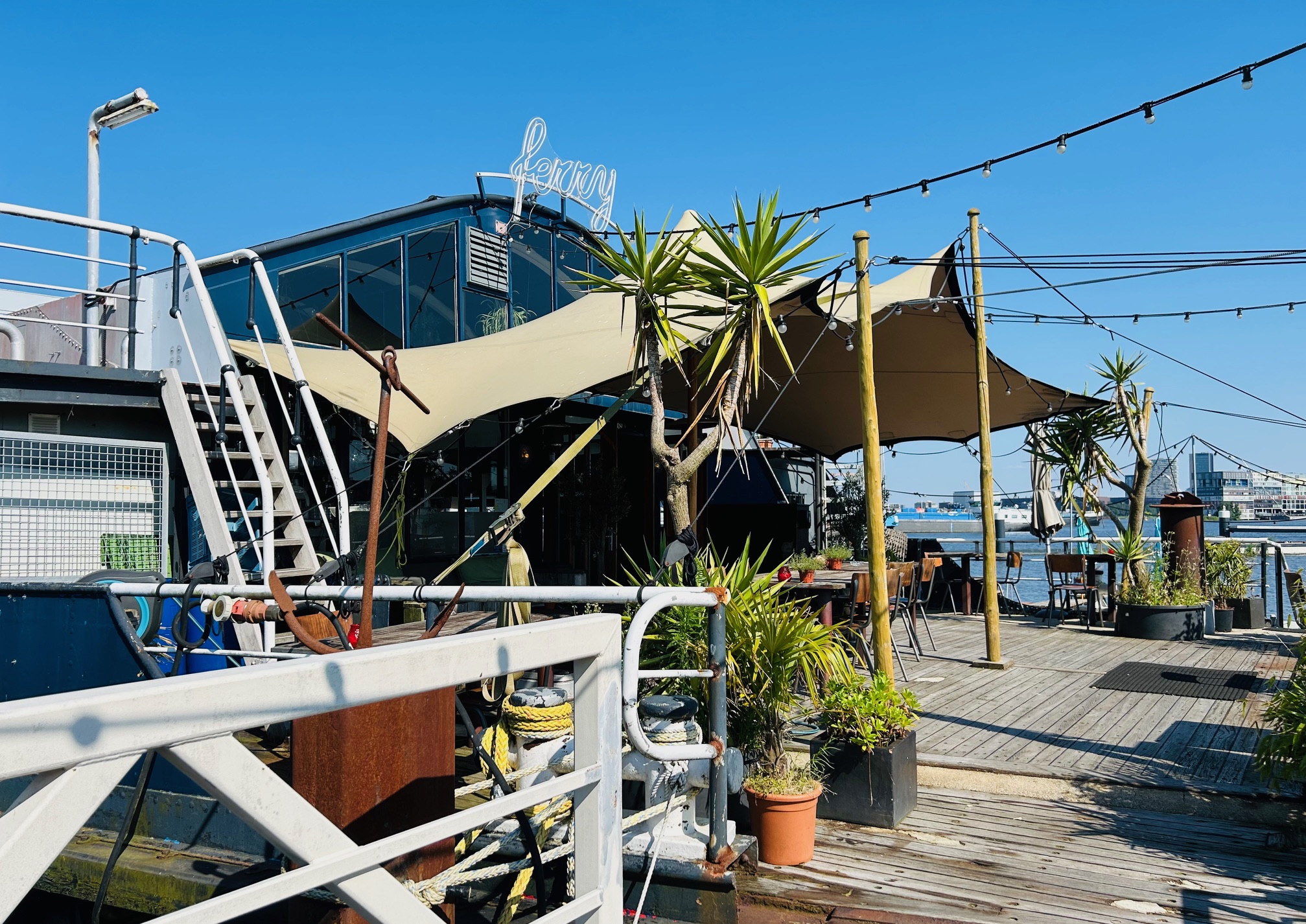 Voordat Ferry de deuren opende, werd de boot gerenoveerd. Inmiddels is de roest aangepakt en is de pont weer waterdicht. Bling-bling hoef je hier niet te verwachten: Ferry heeft dat rafelrandje dat je in Noord vaak ziet. Rond de boot groeit het gras alle kanten op en krijsen rode, gele en roze veldbloemen om aandacht. Binnen zit je aan houten tafels en kun je nog steeds door patrijspoorten naar het IJ gluren. Op het dek staat een loeigrote BBQ tussen junglewaardige planten. Vanaf het dek is het uitzicht fenomenaal: water zo ver je oog reikt, ergens op de achtergrond de wijk Houthaven die zichzelf nog aan het uitvinden is.