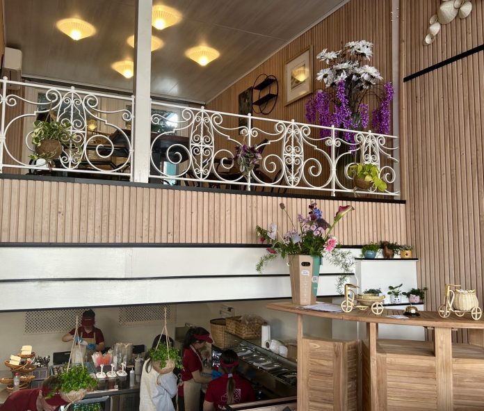 Door het vele hout, ook aan de muur, heeft het interieur iets warms. Kleurrijke bloemen, véél Vietnamese souvenirs: kegelhoedjes van bamboe, rieten riksja’s. Op de hoge tafel naast me staat een mechanisch poesje te zwaaien. Een medewerker ziet ons rondkijken. “Het was een flinke verbouwing, maar iedereen heeft meegeholpen, familie, vrienden. Ongelooflijk wat je samen kunt bereiken als je doorzet.”