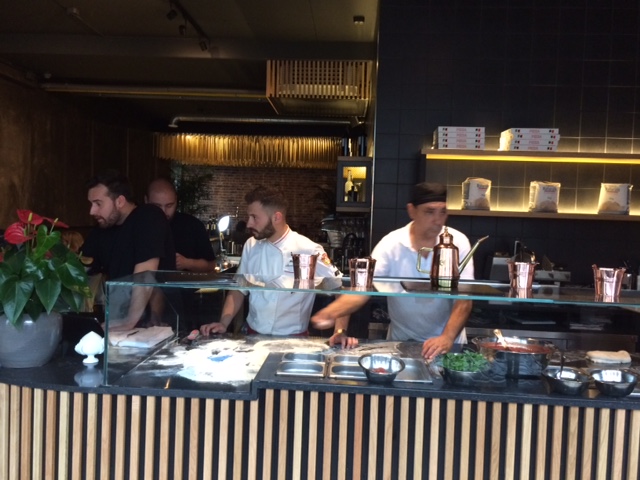 Het goud op de pizza past uitstekend bij de gouden details in het robuuste zwartgrijze interieur. Een Dubai-fähige setting met Italiaanse warmte. Adriano Favia en Andrea Roncone brullen ‘buona sera’ als we binnenkomen, terwijl de pizzabakker achter hen een lap deeg in de lucht laat tollen. Adriano is general manager en samen met ‘drie famous Italian football players’ eigenaar van de zaak, Andrea is manager. Een fraaie blondine – hoe kan het ook anders? – brengt ons naar onze tafel.