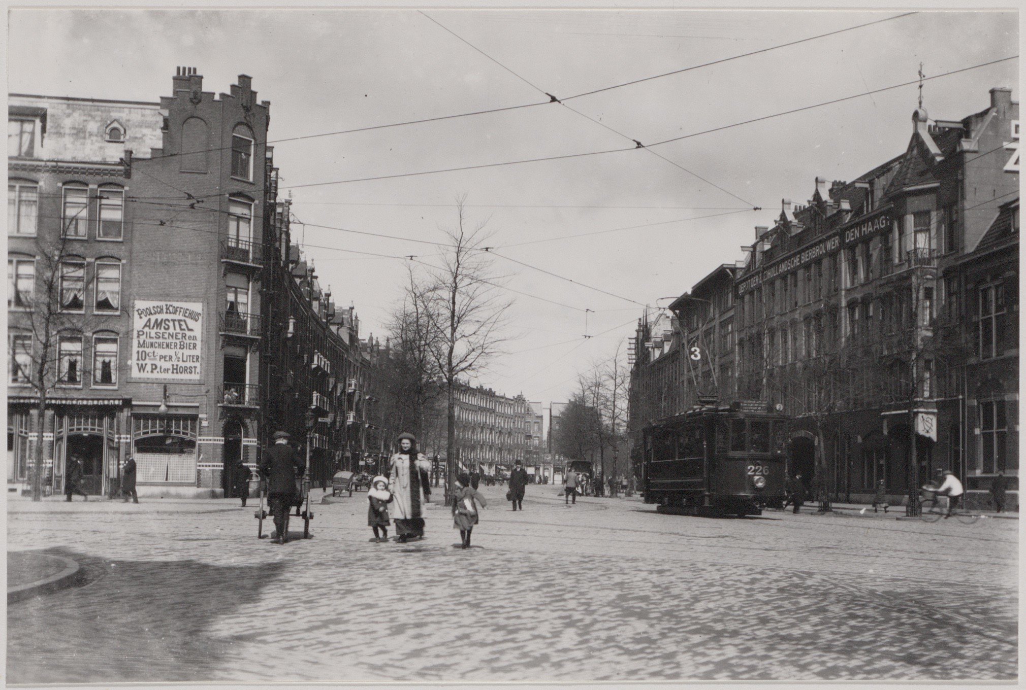 Een tram (lijn 3), voetgangers, een man met een handkar en één fietser: zo zag de Bilderdijkstraat in Oud-West er uit op deze foto uit circa 1907. Links op de hoek met het Kwakersplein zien we het Poolsch Koffiehuis, dat behalve koffie ook Amstel en bier uit München schenkt.