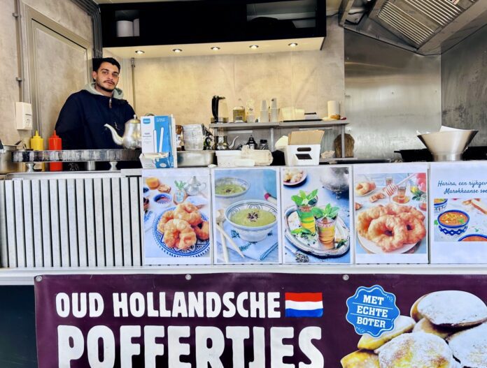 Voor kersverse Marokkaanse donuts schijnt er in Amsterdam maar één plek te zijn: Plein ’40-’45. De kraam die sfenj verkoopt, heeft ook oer-Hollandse poffertjes. “Kijk, dát noem ik nou integratie.”