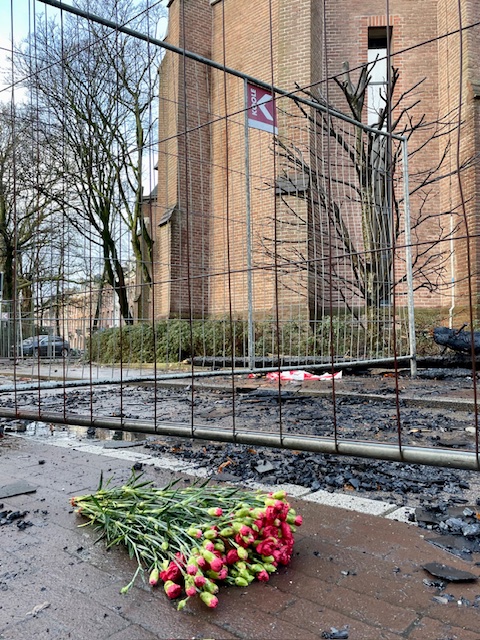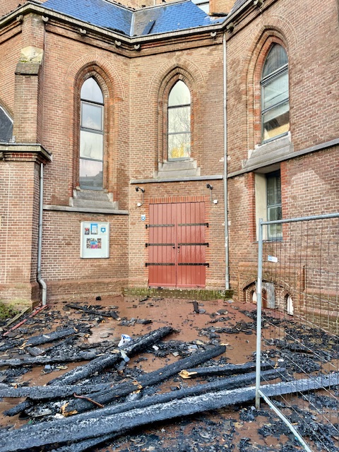 De muren van het kerkgebouw zijn blijven staan na de felle brand in de nacht van 31 december op 1 januari. De hoge toren en het dak zijn volledig verwoest, maar er lijkt een goede kans op herstel. Meteen zijn initiatieven gestart om geld in te zamelen, zoals door stichting Hart voor het Vondelpark.