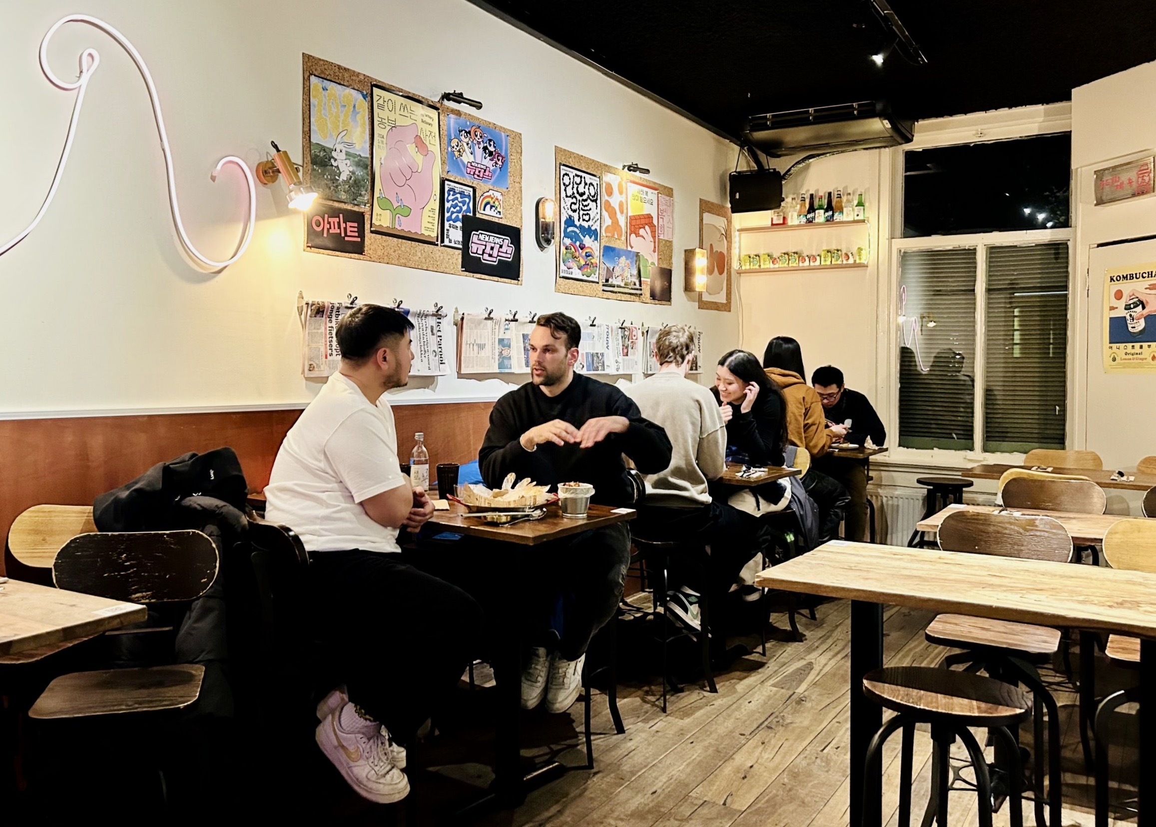 Jeju’s eet- en drankmenu bevat alle hits die je in Zuid-Korea ook vindt: gebakken rijst met kimchi, een salade van glasnoedels met gesneden gekruid rundvlees (japchae bulgogi), een zeevruchtenpannenkoek, viskoekjes aan een stokje. Voor de gefrituurde kip is een glansrol weggelegd: kip met soja-knoflookglazuur (vanaf 17 euro), honingboter of yoghurt-ui? Noem het, en het is er! Het eten wordt bereid door chefs die eerder werkten bij de Koreaanse restaurants Miss Korea en Kim’s So. De eigenaar heeft roots in Zuid-Korea, op het eiland Jeju als ik het goed heb.