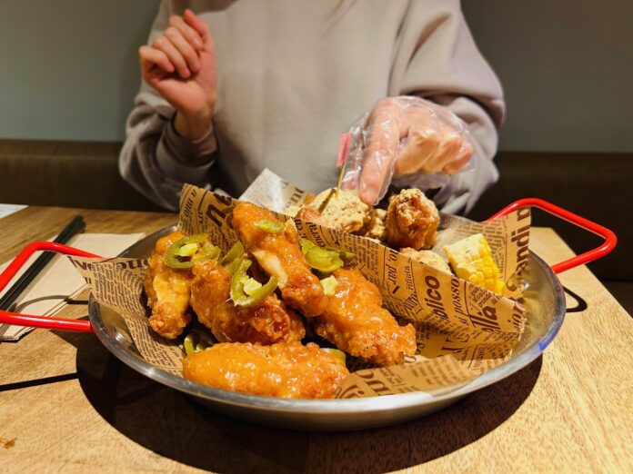Twee tellen nadat ze bij Jeju was binnengestormd, komt er een schaal met Korean fried chicken op haar tafel. Op de ene helft ligt kip met show cheese powder, op de andere helft kip met jalopeño mayonnaise. Behendig doet ze een plastic handschoen aan, zodat ze er ontspannen op los kan kluiven. Met haar plasticloze hand grijpt ze naar het portie kimbap (Koreaanse sushi) dat later wordt geserveerd. We raken aan de praat. De Amsterdamse met Chinese roots blijkt haast te hebben.