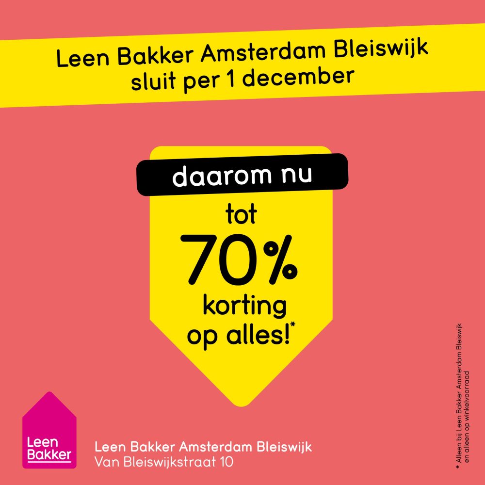 Leen Bakker in de Bleiswijkstraat (Westerpark) gaat per 1 december sluiten. Daarom krijg je nu tot 70% korting* op alles in de winkel! Dus kom snel naar Van Bleiswijkstraat 10 in Amsterdam en pak die korting.