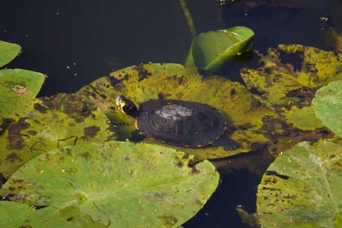 In een slootje aan het voormalige Slotervaartziekenhuis in Nieuw-West ligt een schildpad op waterlelies in de voorjaarszon te zonnebaden. Voorbijgangers werpen een verbaasde blik of blijven staan om het dier te bewonderen. Want ‘is dat nu echt een schildpad daar in die vieze sloot?’