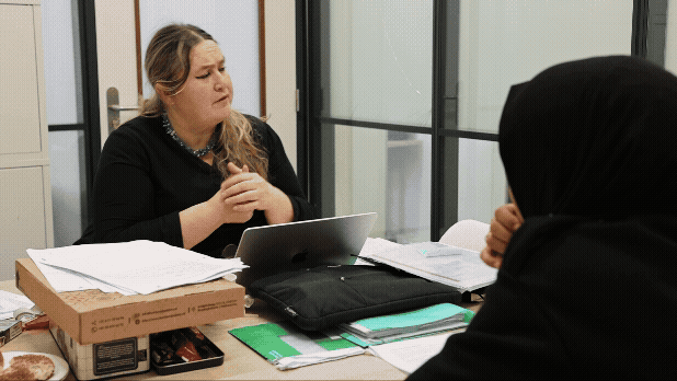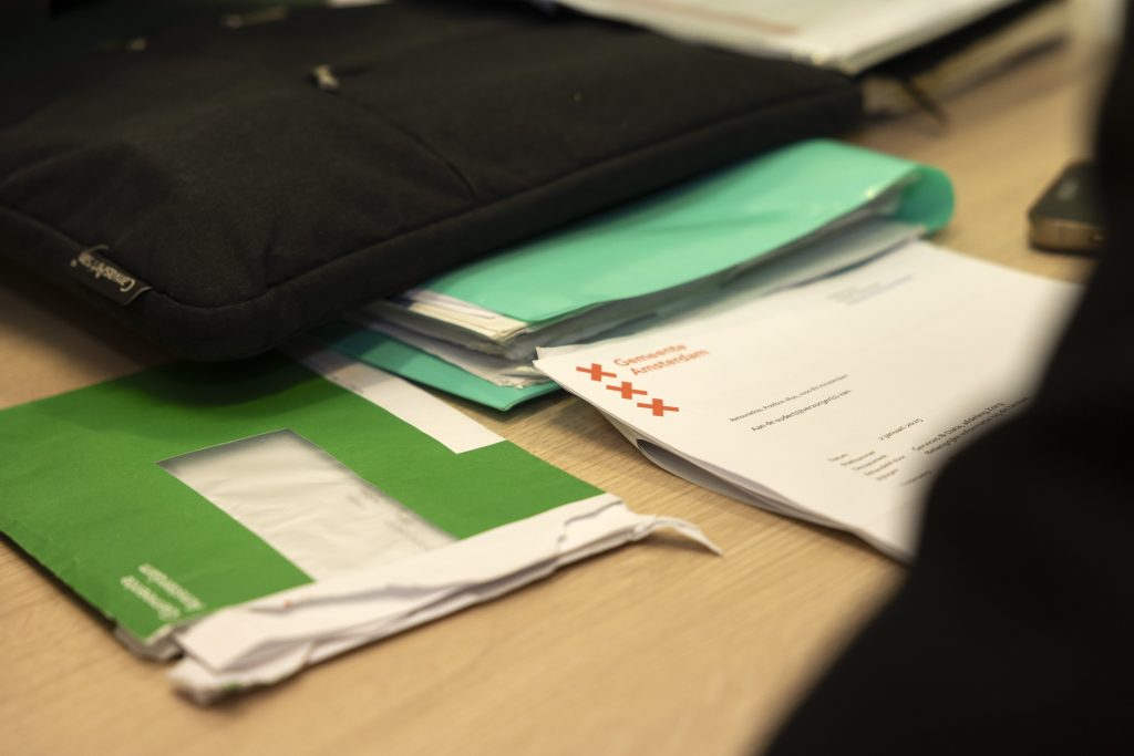Aan tafel zit Ayse*, die langskomt om haar inkomen door te geven. Ze heeft sinds kort werk, twee banen zelfs. In de ochtend werkt ze in de thuiszorg, in de avond verschoont ze bedden in het OLVG. Het werk in het ziekenhuis is zwaar, zegt ze, maar het is beter dan thuis zitten. Wel is ze bang dat ze in de problemen komt nu ze inkomen heeft, en geld moet terugbetalen. “Geen stress, komt goed”, zegt vrijwilliger Berend de Liagre Böhl tegen haar.