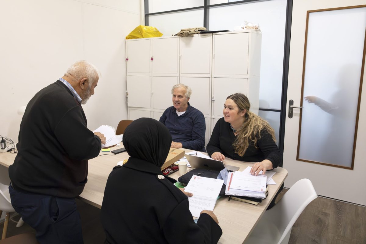 Aan tafel zit Ayse*, die langskomt om haar inkomen door te geven. Ze heeft sinds kort werk, twee banen zelfs. In de ochtend werkt ze in de thuiszorg, in de avond verschoont ze bedden in het OLVG. Het werk in het ziekenhuis is zwaar, zegt ze, maar het is beter dan thuis zitten. Wel is ze bang dat ze in de problemen komt nu ze inkomen heeft, en geld moet terugbetalen. “Geen stress, komt goed”, zegt vrijwilliger Berend de Liagre Böhl tegen haar.