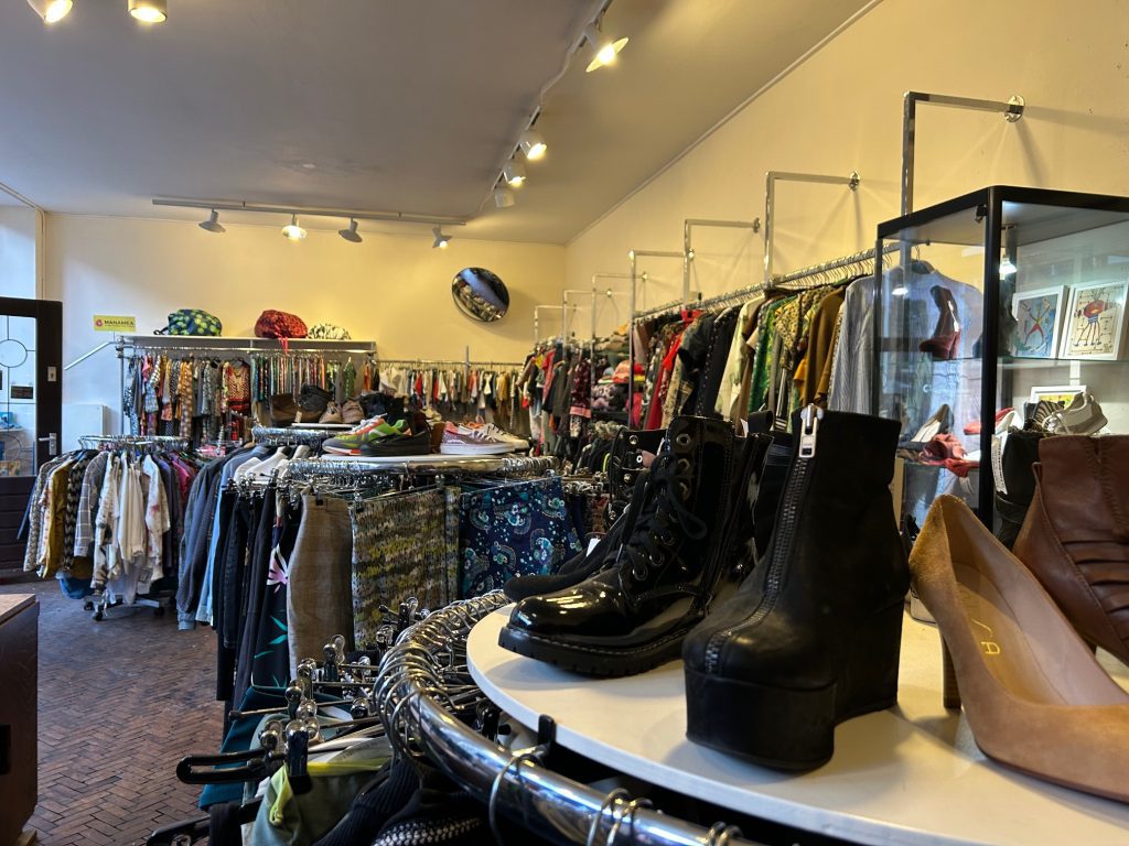 Achterin is een hoekje met positiekleding. Her en der verspreid staan schoenen met plateauzolen en hoge hakken. Op rekken en in vitrines liggen tassen, waaronder een bruine suède tas met leerstukken in verschillende kleuren.
