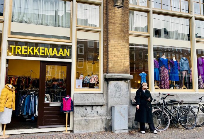 De medewerkers van Trekkemaan in de Bilderdijkstraat 165D volgen geen trends, maar trekken hun eigen plan. Uit de etalage blijkt dat ze de beige-hype aan zich voorbij laten gaan en kiezen voor kleur: kobaltblauw, paars, roze.