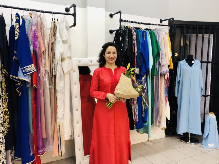 Op zondag 7 mei ging haar kledingzaak in De Baarsjes open. De bakken met noten, en Turks fruit van de vorige eigenaar zijn verdwenen. Ze hebben plaatsgemaakt voor rekken met jurken in heldere kleuren, fraaie prints, soepel vallende stoffen, plus een onmiskenbare, fraaie Marokkaanse twist. Als je meer op de jurken inzoomt, zie je hoeveel tijd er in de details is gestoken: de stiksels, pailletten, knoopjes, het borduurwerk. Met de hand gemaakt, vrijwel altijd door vrouwen. Soms wel door meerdere vrouwen tegelijk.