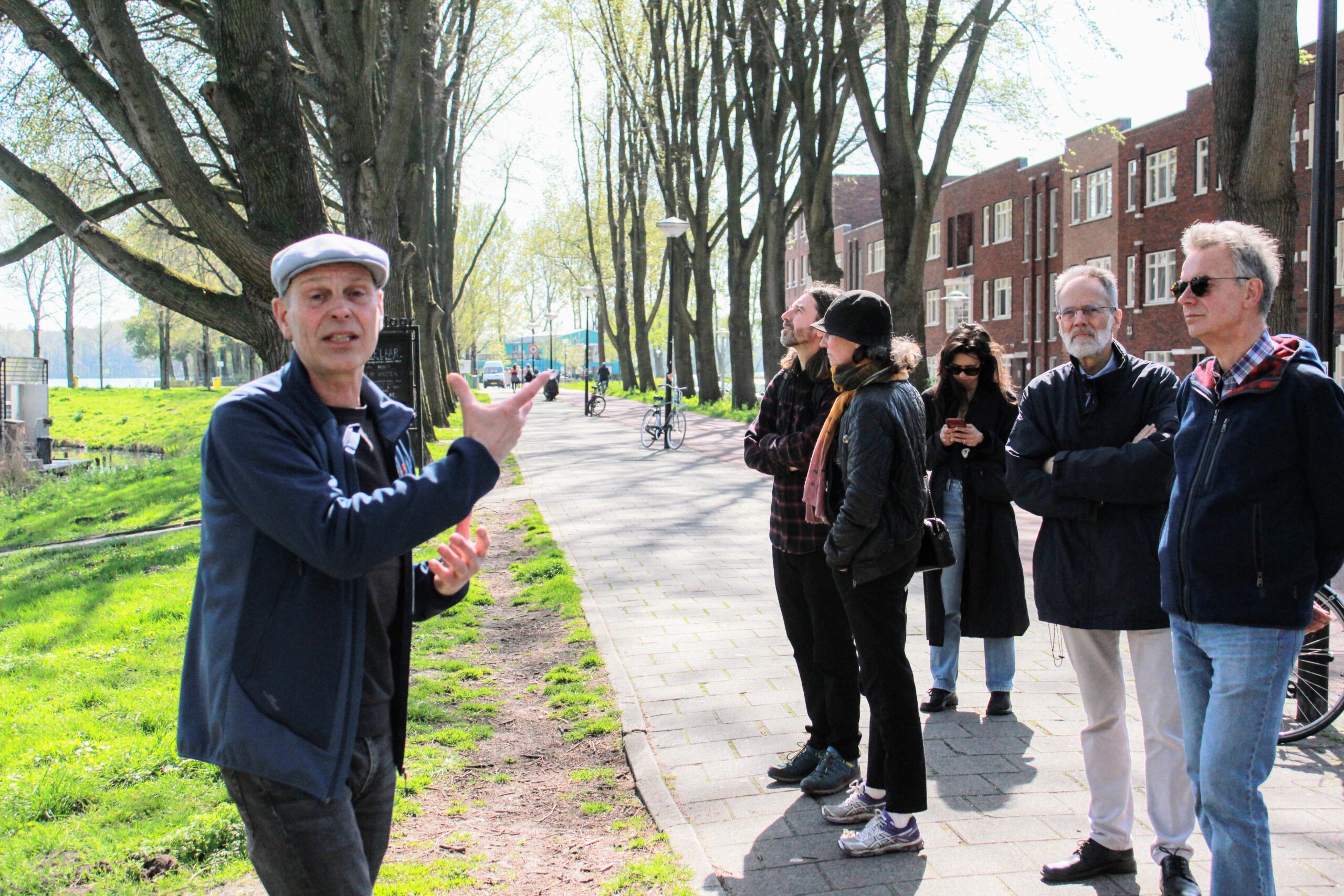 “Voor een rondje Sloterplas heb ik wel een week nodig”, grapt Hans voorafgaand aan de uitverkochte rondleiding wanneer alle deelnemers zich verzamelen in het Van Eesteren Museum. De rondleiding zal dik anderhalf uur duren. Niet dat we heel ver komen. We blijven binnen een straal van 250 meter van het museum. Het weer laat zich vandaag van zijn beste kant zien.