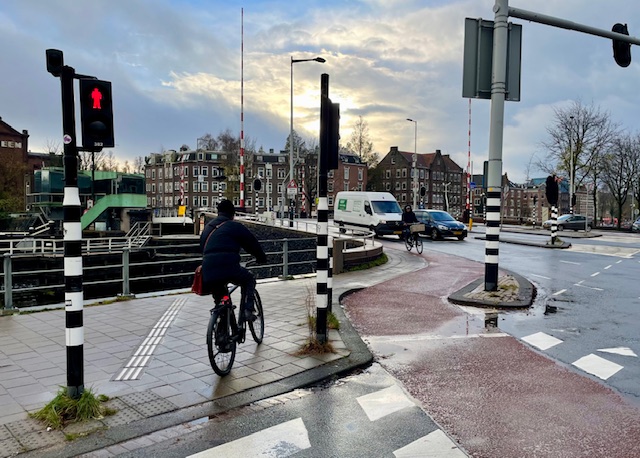 Fietsers moeten nu nog twee keer de drukke kruising met verkeerslichten oversteken, voordat zij verder kunnen rijden over de Van Diemenstraat. In de praktijk doen veel fietsers dat niet: zij rijden tegen de richting in over een smal fietspad of over de stoep bij de Westerkeersluisbrug, met alle risico’s van dien.