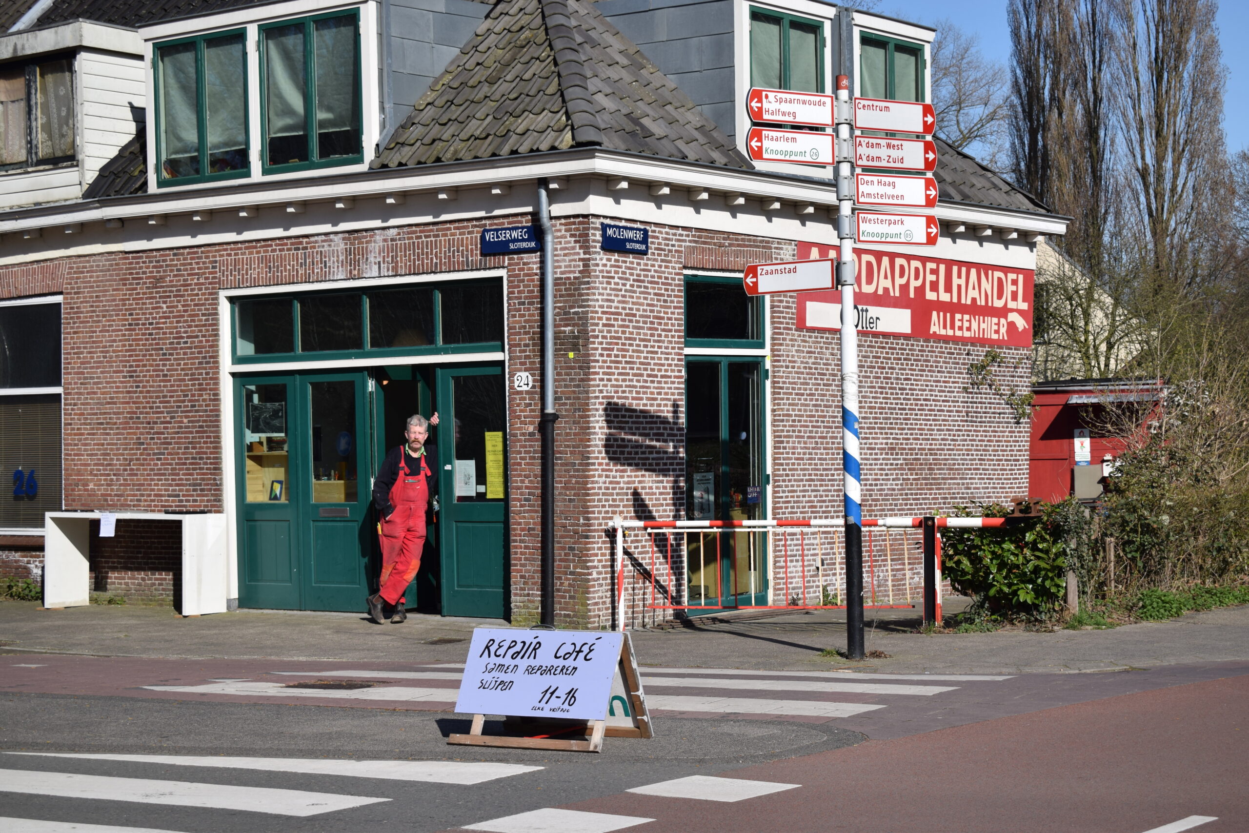 Op de hoek van de Velserweg en de Molenwerf, in het dorp Sloterdijk, staat een huisje met daarop ‘Aardappelhandel’. Dit is de werkplaats van Reinier Schlichting, op donderdagen en vrijdagen is hier een Repair Café. In tegenstelling tot andere Repair Cafés is dit nog ‘gewoon’ open.