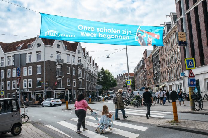 In Amsterdam is het nieuwe schooljaar weer begonnen. Om alle scholieren veilig naar school te laten gaan, roept de Vervoerregio Amsterdam weggebruikers op om extra alert te zijn. Op veel plekken zijn blauwe spandoeken opgehangen in het kader van de campagne ‘Onze scholen zijn weer begonnen’.