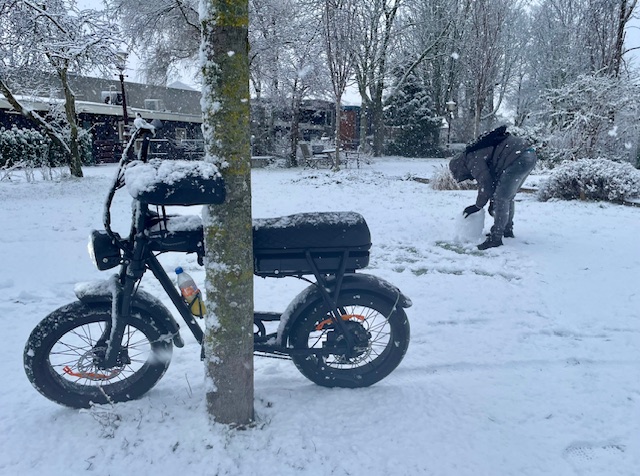 Flinke buien zorgden voor een laag sneeuw maandagochtend in West. Dat geeft overlast, maar ook plezier. Fietsers, voetgangers, automobilisten, allemaal probeerden ze hun weg te vinden door de witte wereld. Een fatbiker stopte om een sneeuwpop te maken (foto onder).