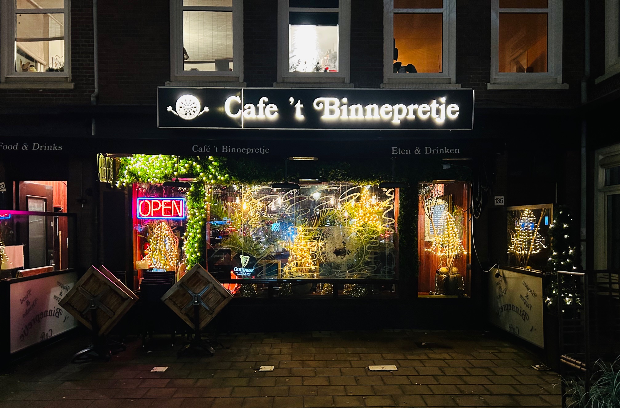 We merken dat zelfs op een doodgewone doordeweeks dag de stemming erin zit. Disco en René Froger op de achtergrond. Gedempt licht, het geluid van rollende dobbelstenen, bulderlachjes, oprecht vriendelijk personeel. We voelen ons hartstikke welkom, ook al zijn we hier voor de eerste keer. Bij ’t Binnepretje zitten we er zó comfortabel bij dat we even vergeten dat de wereld in de fik staat.