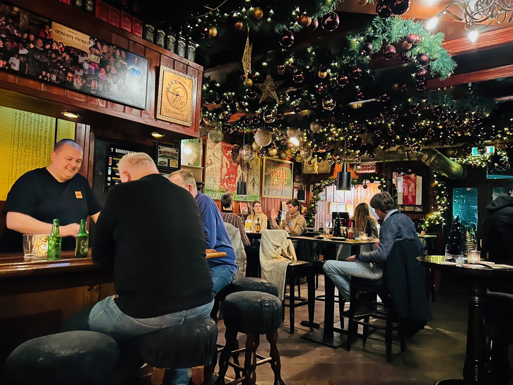 Naast ons zitten Spaanse toeristen, aan de toog hangen stamgasten. Achterin is een darthoek. De Deurdarters en andere dartclubs hebben hier hun vaste avonden. Aan de muur hangen ingelijste rood-wit shirts en andere Ajax-memorabilia. Speelt Ajax, dan maken de televisie én tap overuren. Volgens Nicky werken de Formule 1-races ook altijd als een magneet.