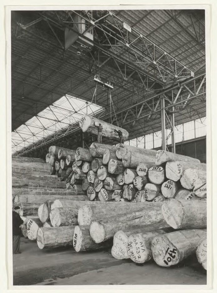 Enorme boomstammen worden opgestapeld in de Houtveemloods. Het is 1950. De stalen loods aan de Nieuwe Hemweg bij de Mercuriushaven is net opgeleverd. Een nieuw hoofdstuk in de groei van de Amsterdamse haven. Reusachtig is de loods van de firma Houtveem: 160 bij 160 meter. Op de berg tropisch hardhout staan twee havenwerkers, die nogal riskant werk doen.