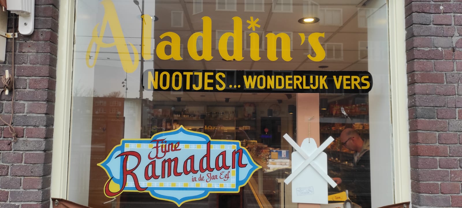 Tijdens de vastenmaand waren bijna alle ramen versierd met stickers om bezoekers een fijne ramadan te vieren, veel van die stickers hangen er nu nog. Adri van der Tang van Knotsknetter: “Ik vind het logisch dat we hier aandacht aan besteden, mijn klantenkring is echt Amsterdams: alle soorten maten, culturen en talen.” Adri, Sufian en de andere ondernemers kijken uit het Ramadan Buurtfeest op zaterdag.