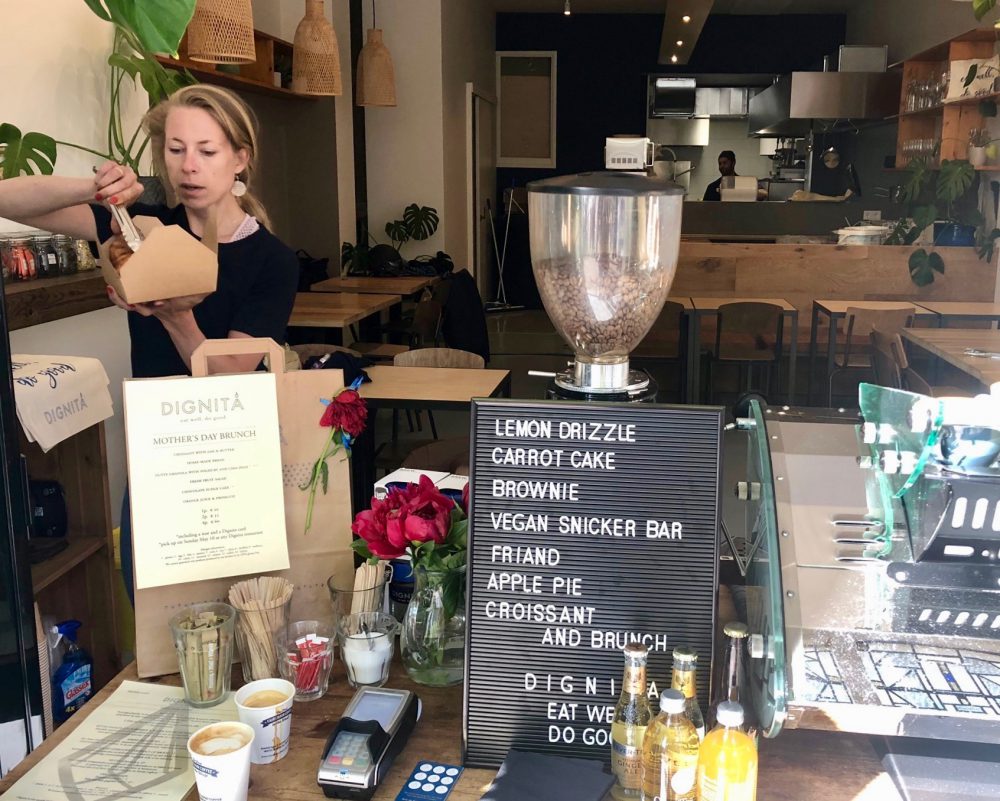 Als wij er rond 9.00 uur zijn, komt de bovenbuurman er uitpuffen na zijn rondje Westerpark en staan drie Amerikaanse twintigers te discussiëren over de beste melk voor in hun latte. Koffiedrinken als rocket science. Hoe 2020 is dat? Ondertussen wordt de straat langzaam wakker en gluren buurtbewoners in het pand waar ooit El Hermano de Kique zat, de enige sherrybar van de stad. Dignita zit er sinds 2 mei. Het is de derde zaak van de mini-keten die het motto ‘eat well, do good’ huldigt. En dat is niet voor niets: 100 procent van de winst gaat naar Not For Sale, een organisatie die slachtoffers van mensenhandel een nieuw toekomstperspectief geeft.