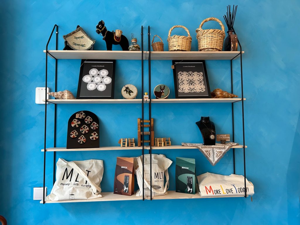 Een voorbeeld is het spetterende interieur waarin blauw en geel domineren. Om héél vrolijk van te worden. Een stuk warmer dan die minimalistische settings waarmee vrijwel elke nieuwkomer tegenwoordig de blits wil maken. Overal waar je hier kijkt, ontdek je wat nieuws. Handwerk bijvoorbeeld: gehaakte kleedjes, rieten mandjes, muurdecoraties, potjes met traditionele Cypriotische zoetigheden, zoals een mengsel van bergamot (citrusvrucht), suiker en citroensap. “Ik mix traditionele elementen met moderne om een ‘artisan vibe’ te creëren.”